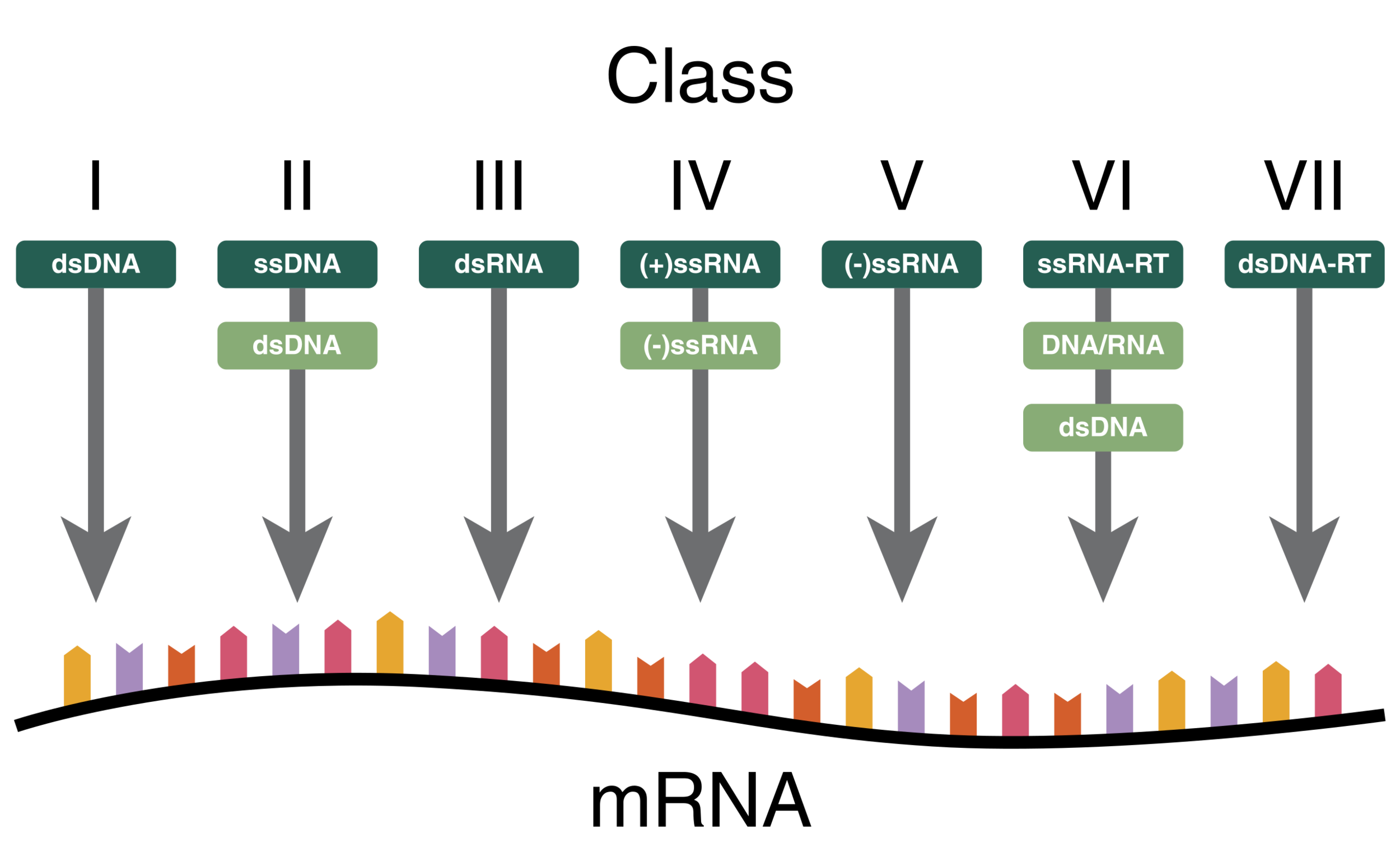 Different nucleotide schemes used by viruses. In dark green is the starting genetic material, in light green are any intermediate steps necessary to produce mRNA, the substrate used by the ribosome to produce viral proteins.