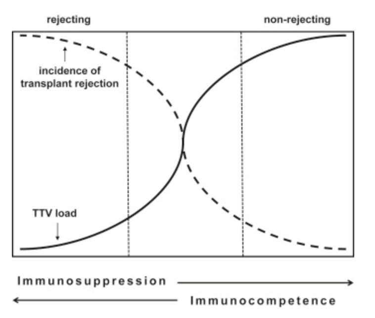 Inverse relationship between blood load of TTV and likelihood of transplant rejection.