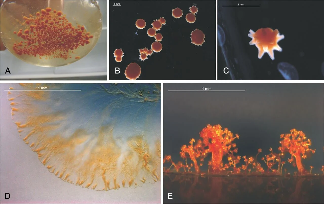 Chondromyces colonies in (A) shaken culture. Closeup photos in (B) and (C). Swarming/gliding motility on an agar surface in (D), and a side-view of fruiting bodies formed on solid agar in (E). Image is from Zaburannyi et al. (2015)