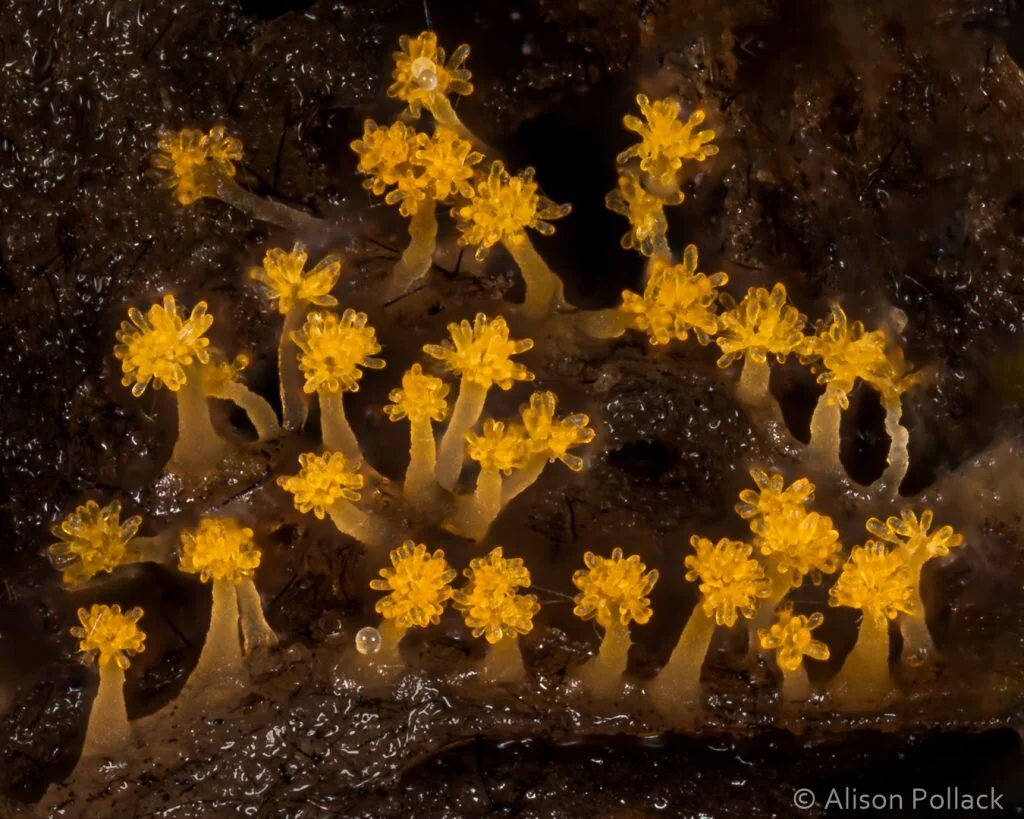 5X zoom of myxobacterial fruiting bodies on a moist surface. Nodules on the fruiting bodies contain spores, which will continue swarming after hatching on a moist surface.
