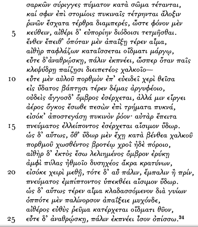 A curious example of poetic science is an initial attempt by the philosopher, Empedocles, to explain anatomical respiration. Empedocles, was a philosopher from pre-Socratic Greece, whose works only survive in fragmentation. In particular, we find his hexameter piece, On Nature, recounted by Aristotle and others. While the rhythm of the passages will be lost in translation, we can easily recognize his application poetic devices — most notably, the simile. Empedocles, makes a first reference to a stream of breath in an out of the lungs, very astutely apprehending the material nature of air. The philosopher accomplishes an attempted mechanistic description of the anatomy by way of a comparison to the clepsydra, a familiar time-keeping apparatus in those days. Below is the original passage as recounted by Aristotle: